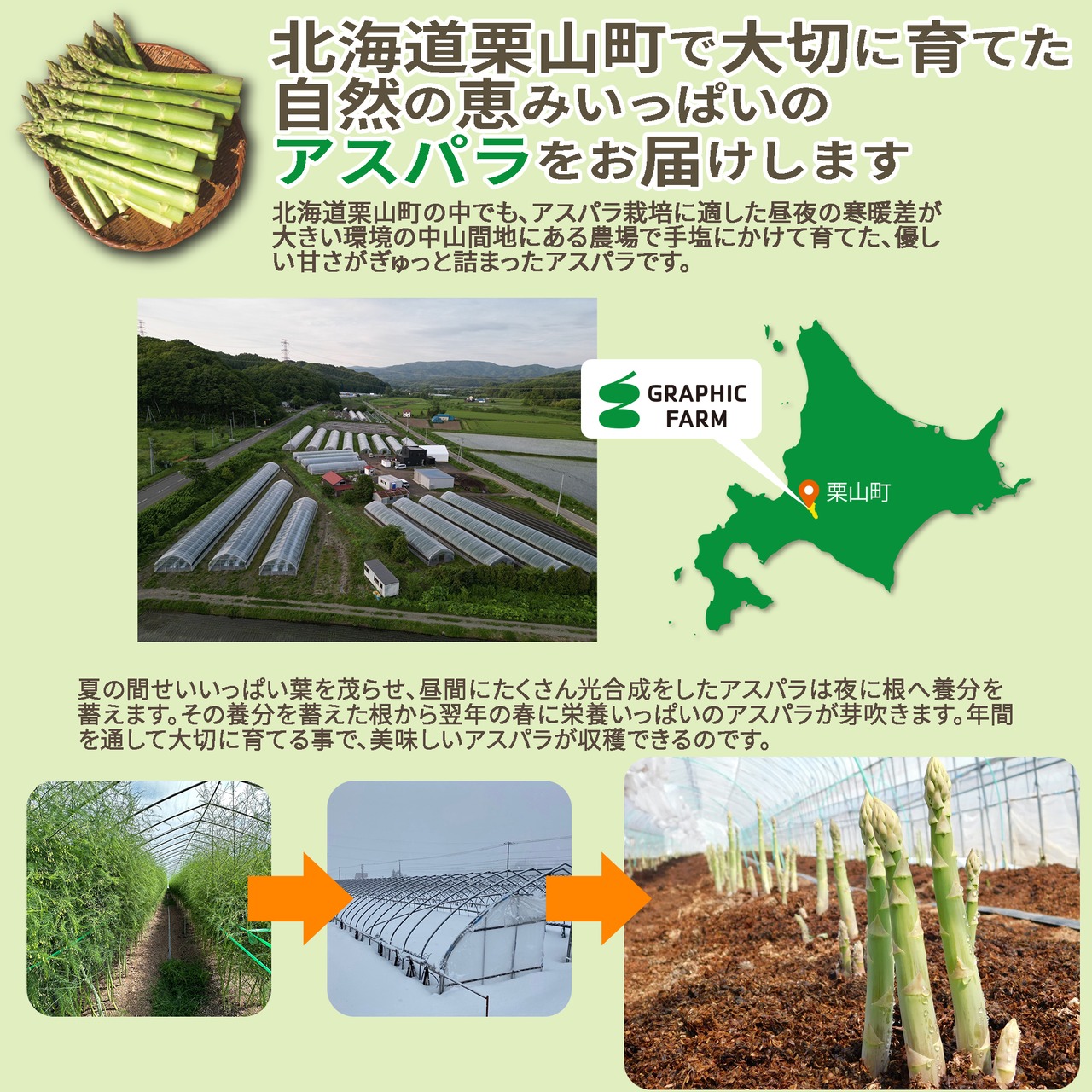 北海道栗山町の中でもアスパラ栽培に適した、昼夜の寒暖差が大きい中山間地にある農場で手塩にかけて育てた、優しい甘さがぎゅっと詰まったアスパラです。