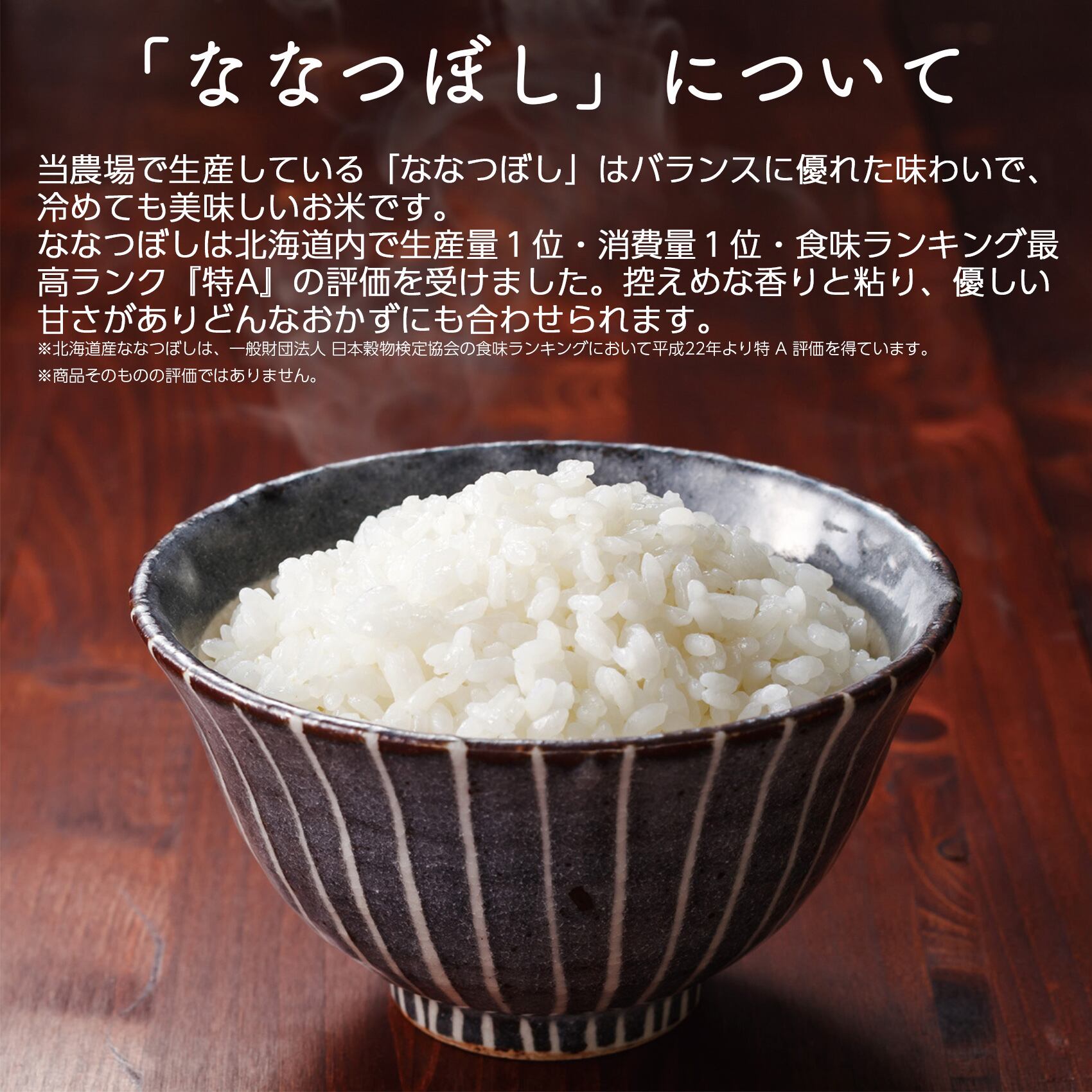 ななつぼしはバランスに優れた味わいで、冷めても美味しいお米です。北海道内で生産量1位、食味ランキング最高ランク「特A」の評価を受けました。控えめな香りと粘り、優しい甘さがあり、どんなおかずにも合わせられます。